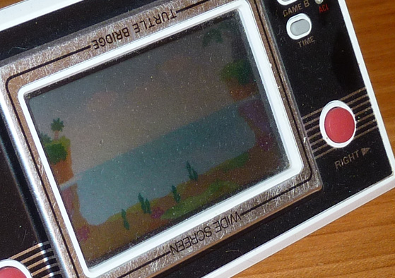 Es ist erst etwas mehr als zwei Monat her, seit die seltene Werbeversion vom Game Lion aus der Gold Serie auf eBay gefunden wurde (siehe Info weiter unten auf dieser Seite). Jetzt ist wieder ein spezielles Game aufgetauch: ein Turtle Bridge aus der Wide Screen Serie, bei dem die zwei Aufdrucke über und unter dem Screen verkehrt herum sind. Die Aufdrucke Turtle Bridge über dem Bildschirm und Wide Screen darunter sind um 180° gedreht, so als ob das Game bzw. die metallene Platte falsch herum in der Maschine lag.